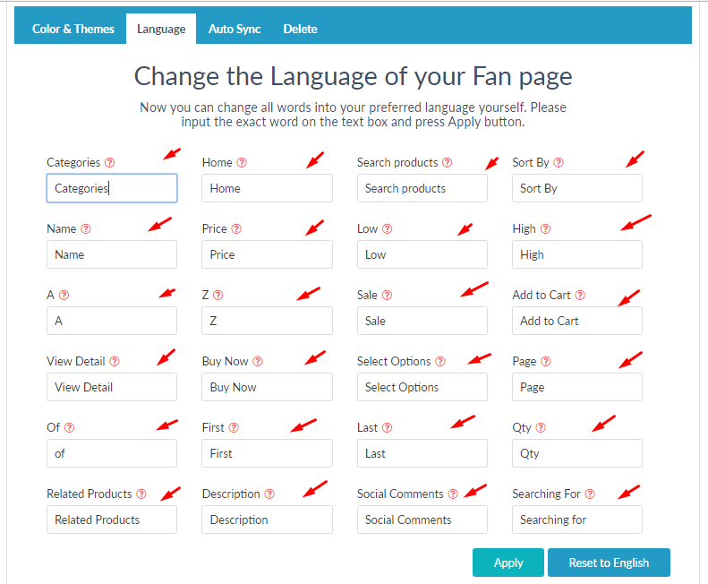 Here you can change all the words in your preferred Language by entering the values in the specified textfields.